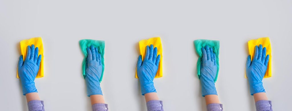 Employee hands in blue rubber protective glove wiping wall from dust with dry rag. General or regular cleanup. Commercial cleaning company.